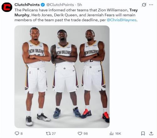 赛前传来了一个消息,根据《雅虎体育》记者克里斯-海恩斯的消息,鹈鹕队已经告知联盟各队,在交易截止日前:锡安、墨菲、奎因、费尔斯、赫伯特-琼斯五人都会留在鹈鹕阵容中,这5人之外的球员才能被交易。