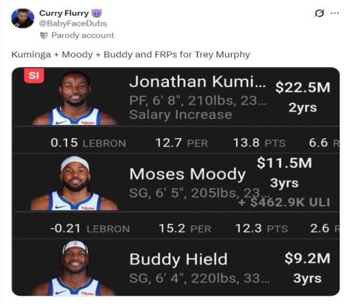 勇士媒体还在憧憬用穆迪+希尔德+库明加+1个首轮签去换墨菲,他们的如意算盘就这样落空了,说实话这三人对于鹈鹕阵容来说的确没有什么大用,而且薪资也不匹配,墨菲今年只有2500万的年薪。