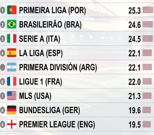 各联赛每90分钟犯规次数榜:葡超25.3次居首、意甲24.5次第三